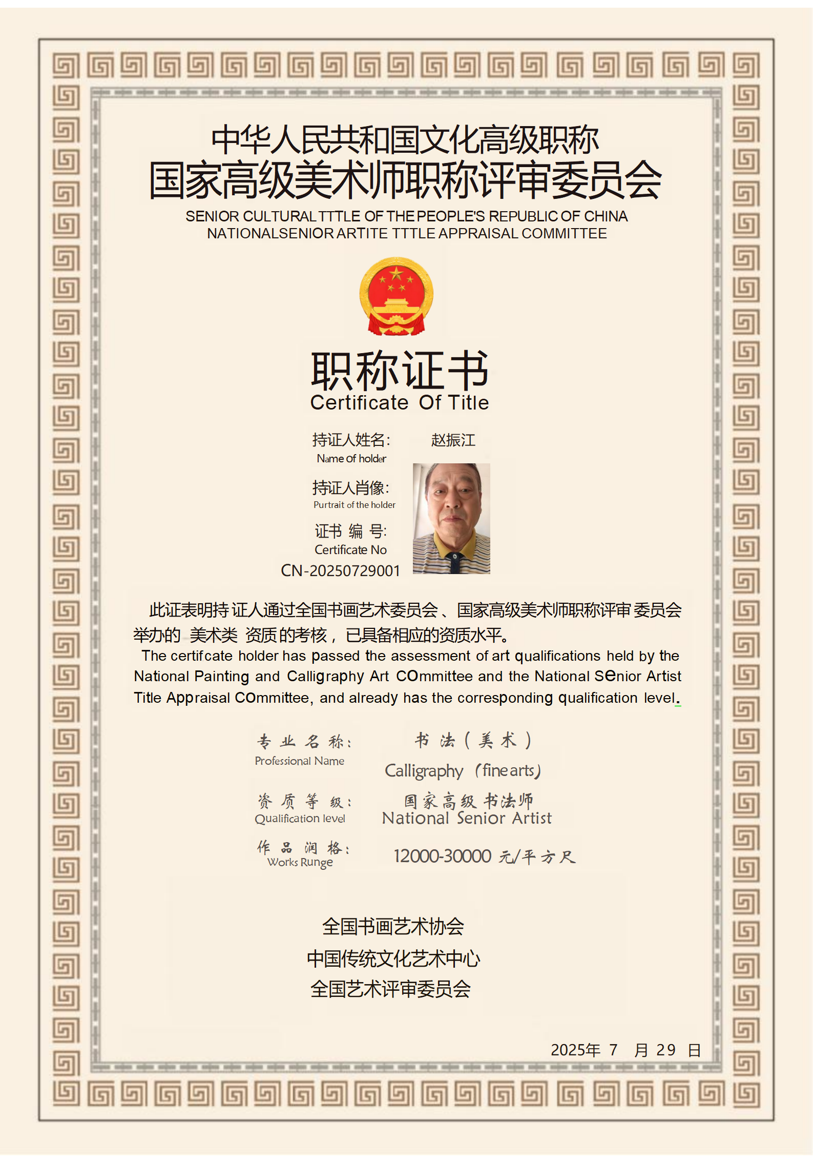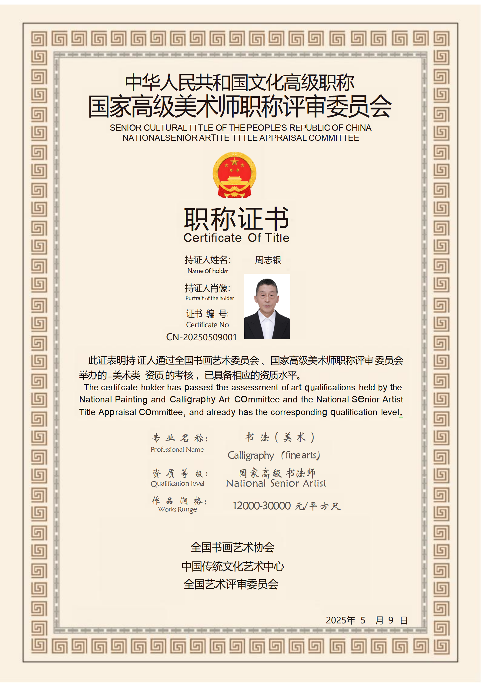 周志银,男,59岁,浙江衢州市龙游县人。中国书法家协会会员,中国老年书画研究会会员,中国书画家协会会员,中国(香港)美术家协会会员,中国香港国际美术家协会会员,北京清华大学美术学院聘请为书法实践创作类长期客座教授。龙游县老年书画研究会会员,龙游县离退休教师书画会会员。国礼书画家,国家一级书法师,一级美术师,中华国礼高级书画师。人民书画家,中央电视台CCTV华夏之声特邀艺术家。2023(迎光杯)全国书画大赛荣获《最具影响力艺术名家》称号。书法组特别白金奖,美术组特别金奖,一级书法师资格证书,一级美术师资格证书。,润格证书。2023年第二届华夏兰亭奖,全国名家书画大赛,荣获(二等奖)奖杯及证书。2023秦韵杯全国书画大赛荣获二等奖,奖杯及荣誉证书,北京秦韵源书画院会员。2023年被中央電视台艺术名家栏目,艺术传承栏目授予中国艺术名家书法创作基地。2023年,纪念伟大领袖毛主席诞辰130周年,全国书画艺术名家大赛,荣获三等奖,奖杯及证书。江南翰林诗书画院院士,珍迹(杭州)书画院院士,周恩来文化研究会研究员。2024年年度优秀作品评审中表现突出,荣获秦韵杯全国大赛:“最具潜力奖“。2024年入选世界文联文艺百名艺术名人名家前23名,被评为十佳艺术家奖及奖牌,和十佳节术家奖荣誉证书。2024年创作素描马灯,高70公分,宽50公分,被中国国家博物馆永久收藏,并颁发收藏证书。2024年5月10号至13号在北京,为了弘扬传统文化,遵照国家号召,让传统文化走出国门,走向世界,送书画到几内亚共和国大使馆,和赞比亚共和国大使馆,并让外国外交官,和我一起认中国字,一带一路并留影。作品被两家使馆永久收藏,并颁发两国使馆中外文化传播使者称号,成为中华人民共和国,国礼书画家及荣誉收藏证书。2024年11月10日参加全国《国粹杯》书画艺术大赛,荣获美术组一等奖,获得一等奖奖杯及一等奖金牌。2024年11月21日荣获第7届世界文化交流伟大贡献奖,世界文化大使勋章。其个人近照,杰出成就入编2024中英双语版《世界名人录》。2024年11月28日,被评选为《年度盛典》中国好品牌影响力艺术家,并颁发证书及奖杯。在2024年《年度盛典》,中国好品牌中,被被为十大最有影响力艺术家,并颁发了奖牌及证书。在2024年,12月13号受邀参加北京第五届中外外交官商界领袖之夜既中国好品牌,中国文化国际传播盛典活动中,获得了与会各国嘉宾的一致认同,被特聘为《中外文化交流使者》称号,并颁发了证书,并与各国外交官一一合影留念。2024年12月26号在江西萍乡参加红色记忆,纪念伟大领袖毛泽东主席诞辰131周年活动并捐赠作品,和各特型演员们一起拍摄影视并留念,并颁发为红色文化优秀传播者荣誉称号。2025年元月八号,参加中央电视台春节联欢晚会排练及现场书法书写,并获得证书及奖牌。2025年元月12号,在上海参加塞尔维亚前总统和黑山前总统,中外文化交流晚宴,两幅作品被两位前总统永久收藏,并授予中外文化传播使者称号,并颁发证书。2025年4月7号,被北京和宸国际文化集团,聘请为文化资深艺术顾问,并颁发证书。2025年4日8日,为了宣传中国的传统文化,送文化进智利驻华大使馆,并教智利外交官和我一起读中文,作品被智利大使馆永久收藏,并和外交官先生一起合影,并颁发收藏证书。