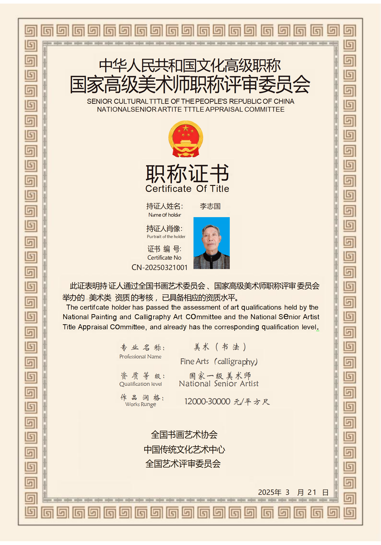 李志国,字凌凯,一九五三年出生,江西省萍乡市莲花县人。从小就酷爱学习,是学校的优秀学生,曾受几位名师的指教,在画艺上有所进步。动乱时期被迫辍学,沦为一介布衣。前些年参加过几次美术竞赛,并获得了一定的奖励!这些奖励并没有让李志国先生知足止步,而是成为他前行的动力。2024年7月应邀入编了央视栏目出版发行的《盛世中华翰墨华章--时代功勋人物》艺术专刊并获得“时代功勋人物”荣誉称号,得到了社会的认可和人民的广泛好评!