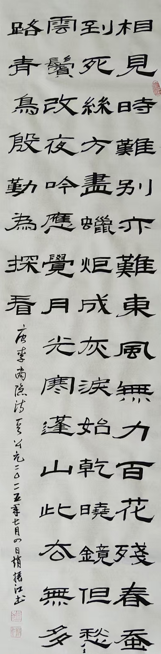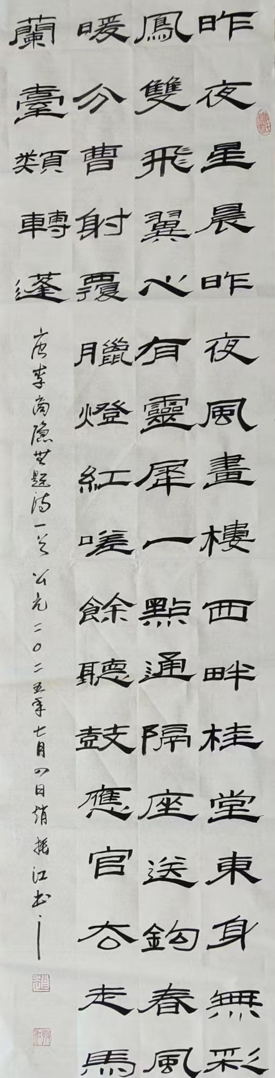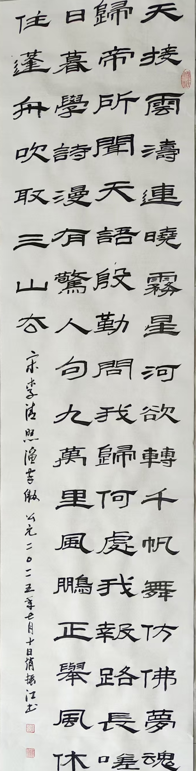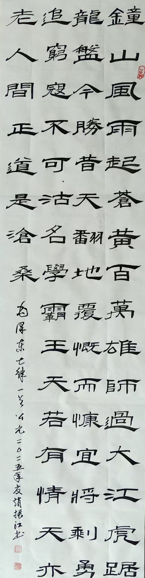 赵振江,1951 年元月生,河南濮阳人,工作于河南省濮阳市烟草局,干部,中共党员。在部队服役 18 年,于 1986 年12 月转业。著名书法家,以俊美的隶书功法和龙腾气质的草书成就而得书法造诣,收获了卓立书坛的名家地位。自幼酷爱书法,从上学的第一天开始拿毛笔学写字,在高小经常写好作文后就用毛笔字誊写在作文本上。在初中上学期间基本上掌握了宋体字和隶书的写作技能。参军后在部队经常挤时间写毛笔字。一九七零年被部队管理科提升为文书,一九七三年被部队提干,任财务科会计。二零零二年三月,为追求书法艺术,在濮阳市烟草局办理了内退手续,集中时间苦练书法艺术,从楷书开始临帖苦练基本功,为节能环保和煅练身体,毛笔字和写地书相结合,每天早晨与晚上用几个小时写数千字,用清水在青石地板和水泥地面写毛笔字。为使书法与锻炼身体为一体,发明了用双手同时写正反 字,既练习了毛笔字又锻练了身体,激活了左右脑细胞的活跃,又提高了大脑记忆能力。经过几年刻苦学习,目前可用双手同写反正字或左手单写正字书写自如,并总结和掌握了一套双手书法艺术,自二零零五年以来苦练草书艺术,收益匪浅,其书法作品多次在省内外出展,并多次在书法导报和刊物及书籍上发表。二零零六年被市书协吸收为会员,现为河南省书法家协会会员。书法作品经常在专业书法报刊杂志上刊行,并多次在各级艺展获奖,并于 2006 年加入省市两级书法协会,成专业会员,完成了从一位书法爱好者晋身为专业书法家的华丽转身,可谓是功成名就。